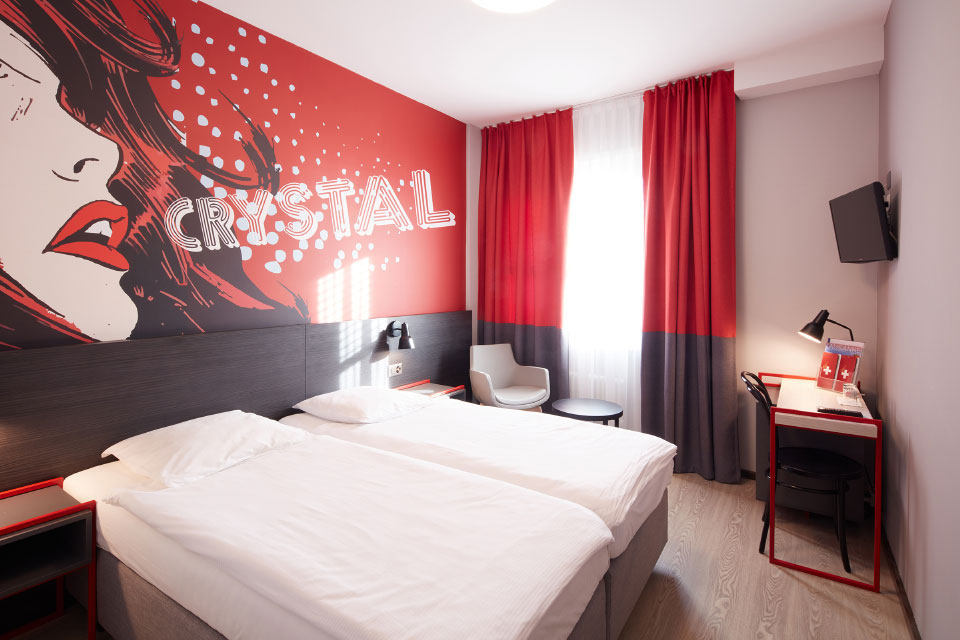 Plongez-vous, le temps d’une nuit, dans le Lausanne des années 1950, avec nos chambres incomparables, parfois rehaussées de touches de couleurs vives, agrémentées d’une œuvre contemporaine, ou parfois inspirées du Pop Art et des œuvres d’Andy Warhol ou Roy Lichtenstein. Au Crystal Hôtel, aucune chambre ne se ressemble !
